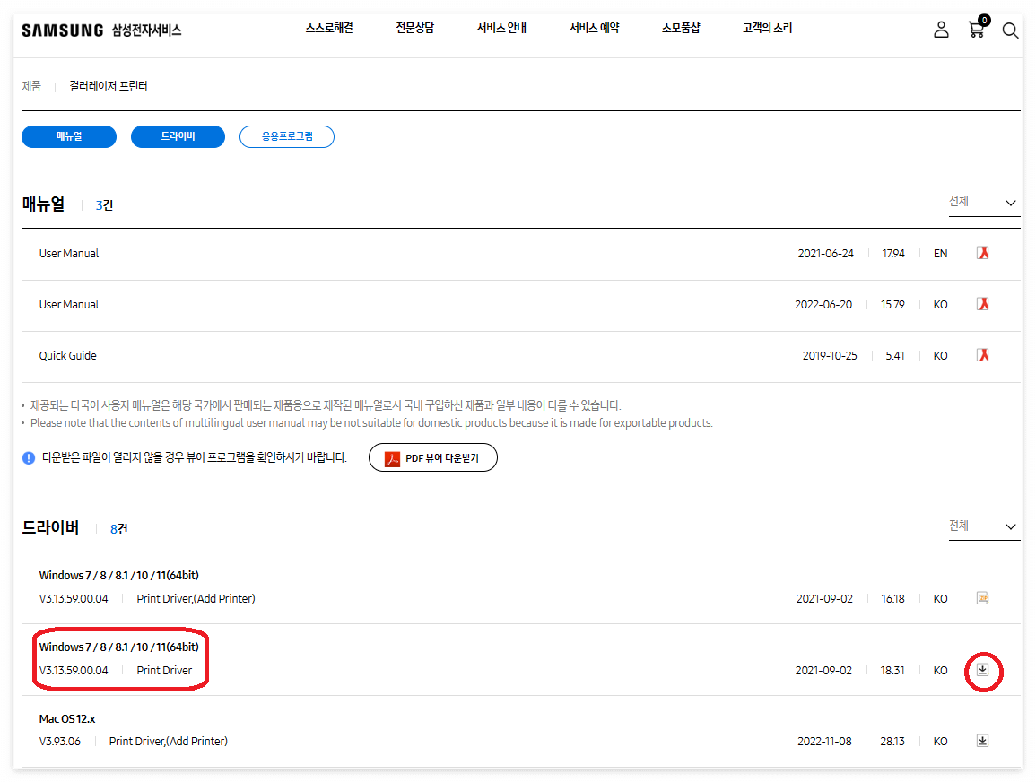 홈페이지 상단 메뉴→ [스스로 해결] → [다운로드 자료실]로 이동하여 프린터 모델명을 검색하고, 드라이버 메뉴에서 제 PC 운영체제에 맞는 드라이버를 다운로드했습니다. 드라이버 목록에 첫 번째, 두 번째의 차이를 몰라서 저는 그냥 두 번째로 선택하여 다운로드해서 잘 설치되었습니다.