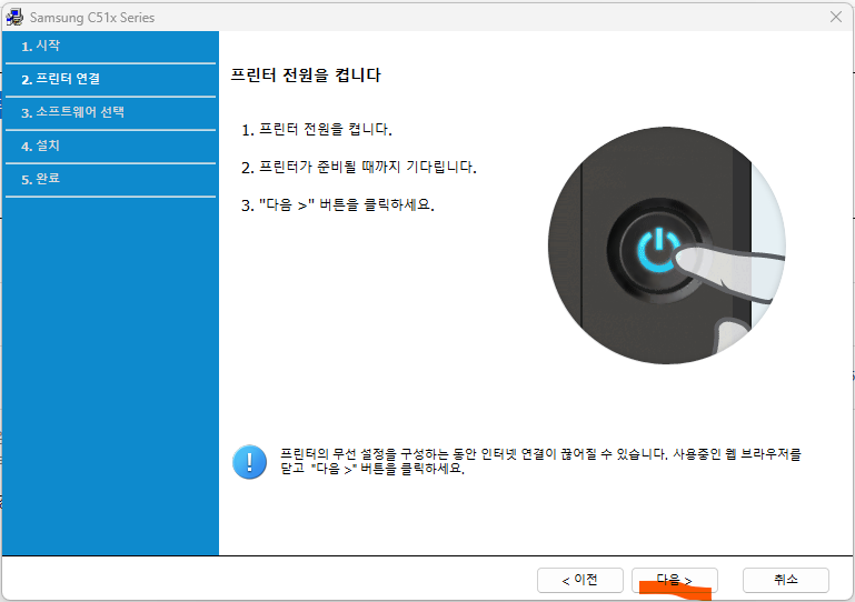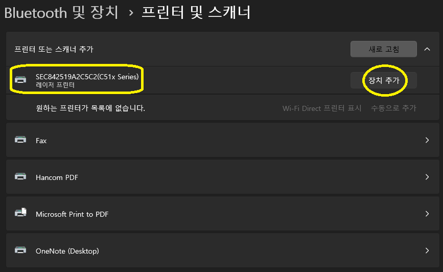 먼저 프린터를 켜고 준비 상태로 만든 후, 컴퓨터에서 프린터를 추가했습니다. 저는 Windows 11을 사용하고 있습니다.
