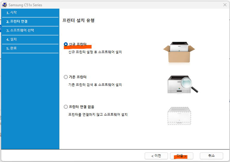 다운로드한 드라이버 파일을 클릭하여 설치합니다. 순서대로 차근차근 따라 하면 됩니다. 3단계 설치 유형 선택할 때는 신규인지 기존인지 몰라서 저는 그냥 신규 프린터로 선택했는데 1단계에서 장치 추가를 해 놓았기 때문에 기존 프린터로 선택해서 진행해도 되지 않을까 싶은데 저는 신규로 선택해서 설치가 잘 되었습니다.