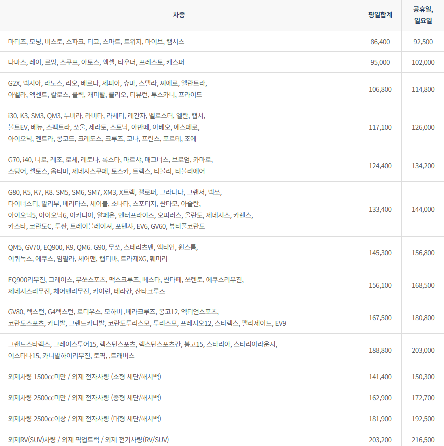 * 특별수송기간(하계피서철, 추석, 설), 주말, 공휴일은 상기 요금에 10% 할증