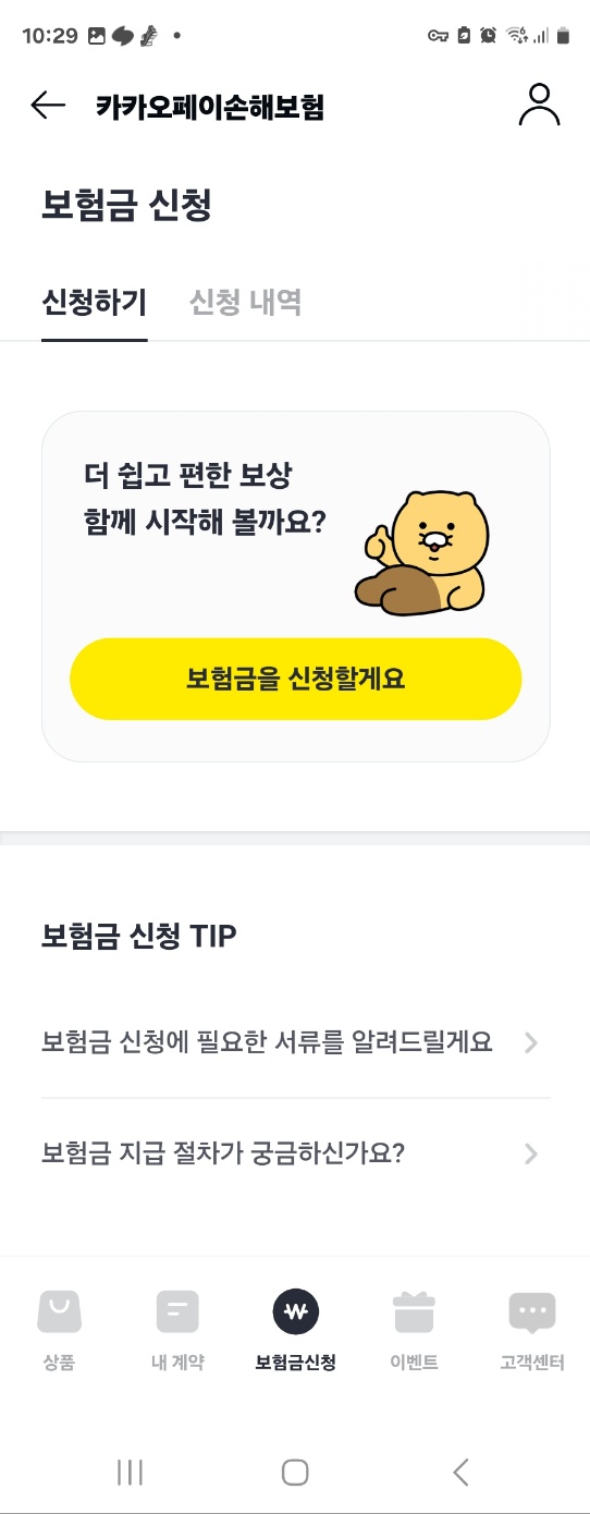 먼저 카톡 메시지에서 보험금 신청하기를 눌러줍니다. 그러면 보험금 신청에 필요한 서류를 확인할 수 있고, 서류 준비가 끝나면 보험금을 신청할게요를 눌러주세요. 그러면 어느 분의 보험금을 신청할지 물어봅니다. 제가 가족 보험을 함께 가입해서 대신 신청할 수가 있어요. 저는 딸의 보험금을 청구하는 것이므로 대신 신청을 눌러주었습니다.