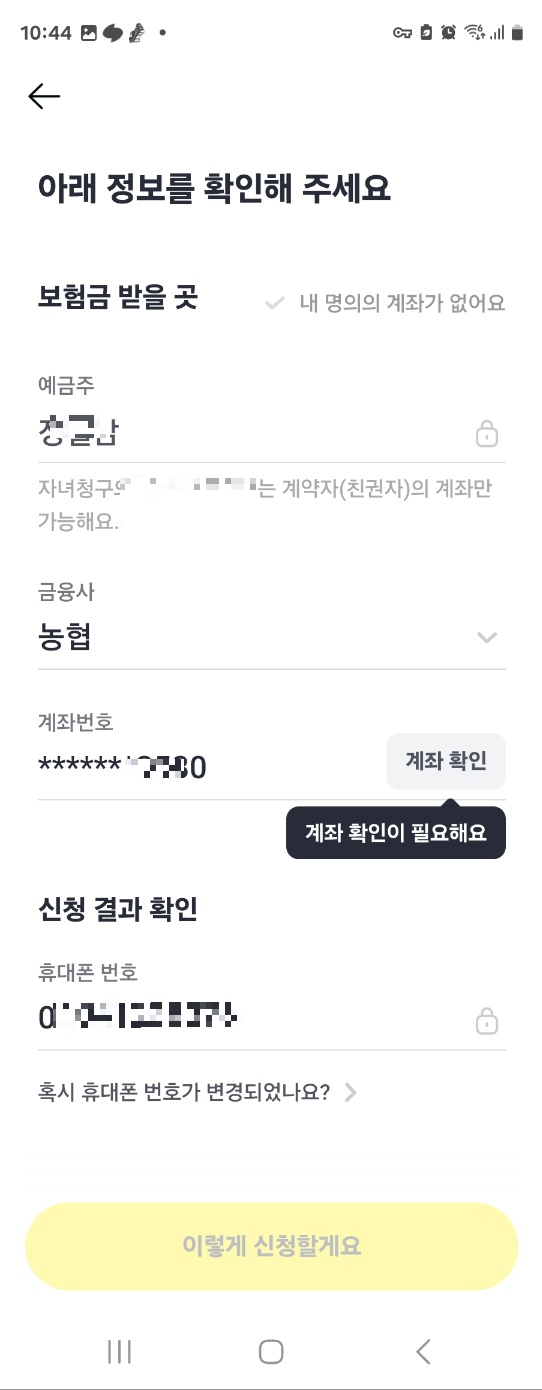 첨부 서류를 제출하면 보험금 받을 정보를 입력하면 보험금 신청이 마무리가 되고 카톡으로 보험금을 신청했다는 알림톡이 온답니다.