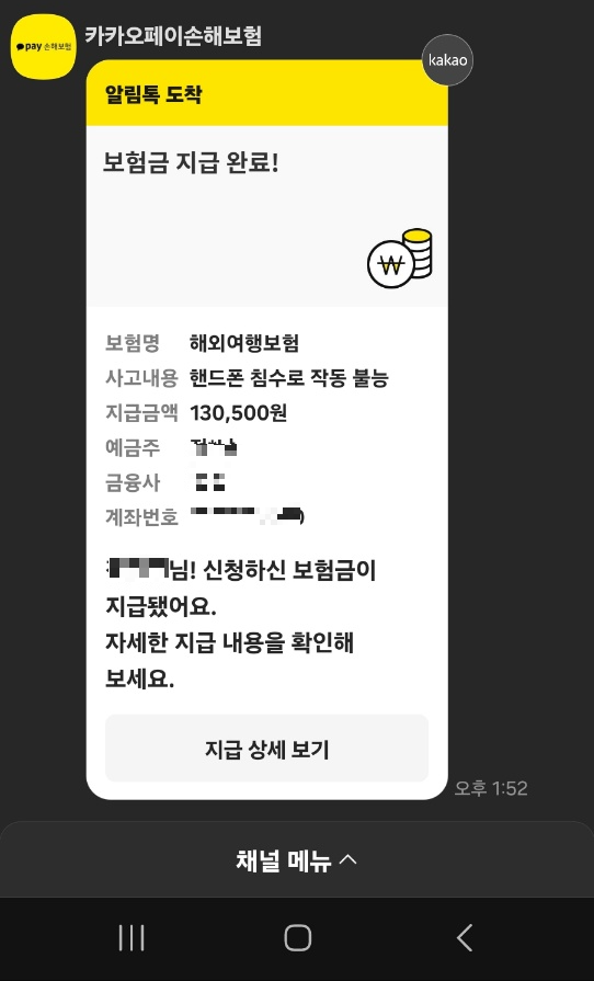 여행자 보험을 신청한 바로 다음날 보험금이 지급되었다는 알림톡과 함께 계좌로 자기 부담금 만 원이 공제된 금액이 고스란히 입금되었습니다. 여행자 보험 너무 좋네요.